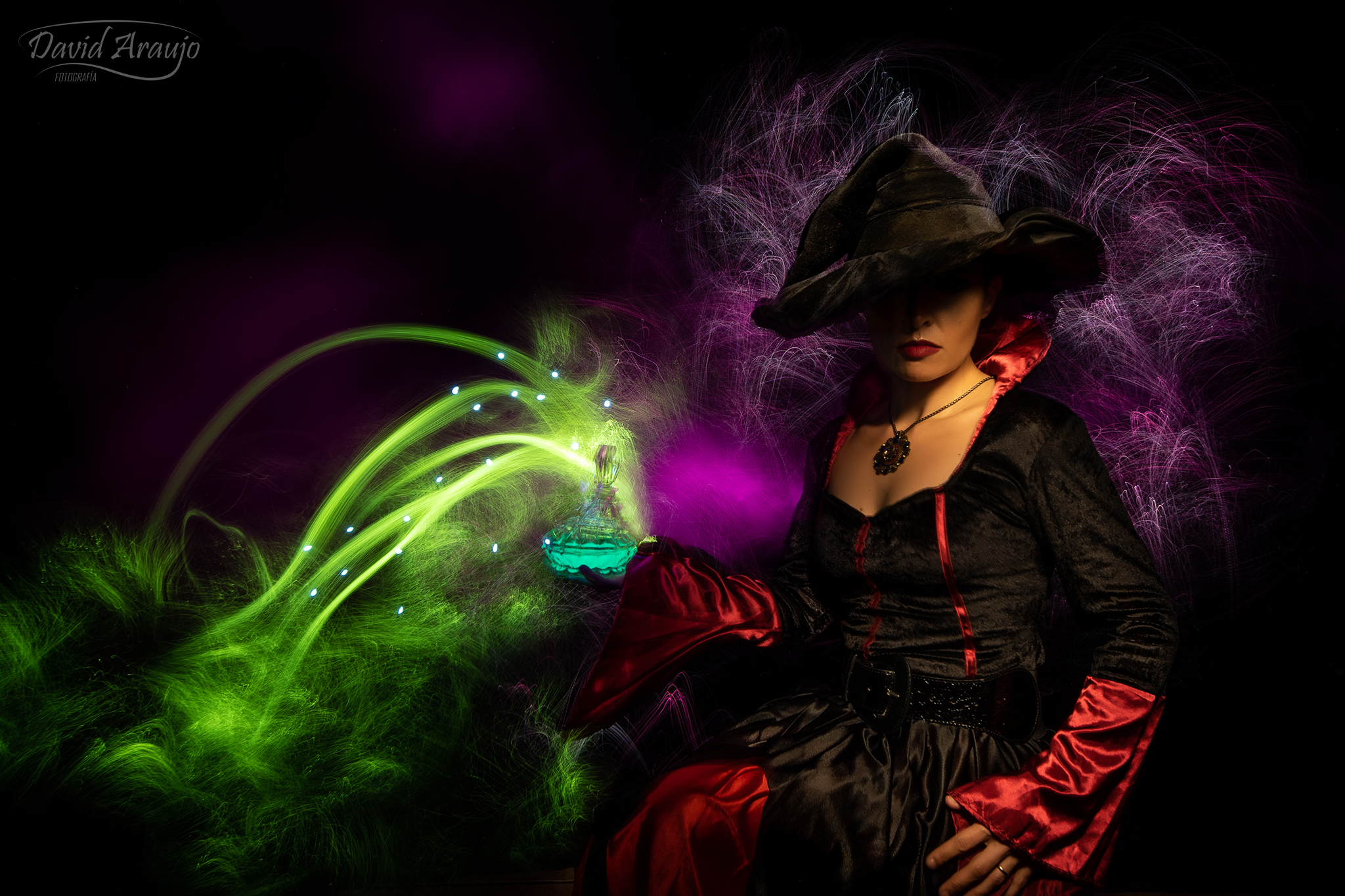 Para esta fotografía he utilizado linterna con luz cálida para iluminar al personaje a mano alzada por ser la fuente de luz más selectiva (de esta manera me era más fácil dejar esa sombra en la zona de los ojos…, puntero led blanco, fibra negra y dos colores con la Magilight de Fotorgear, fibra negra y filtro verde de Light Painting Paradise, vaporizador para el efecto humo y linterna con filtro de color magenta, por último una linterna UV y agua con pintura UV dentro del frasco.